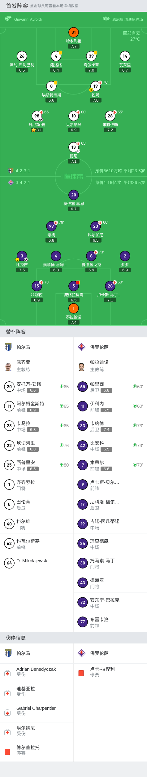 下半场比赛开始后,佛罗伦萨加强了进攻,并在第75分钟得到了扳平比分的机会。比拉吉站在禁区外,一记精准的任意球直接破门,将比分改写为1-1。主场作战的帕尔马队面临着压力,努力寻找反击机会,而佛罗伦萨则加强了对手的限制,试图取得领先。
